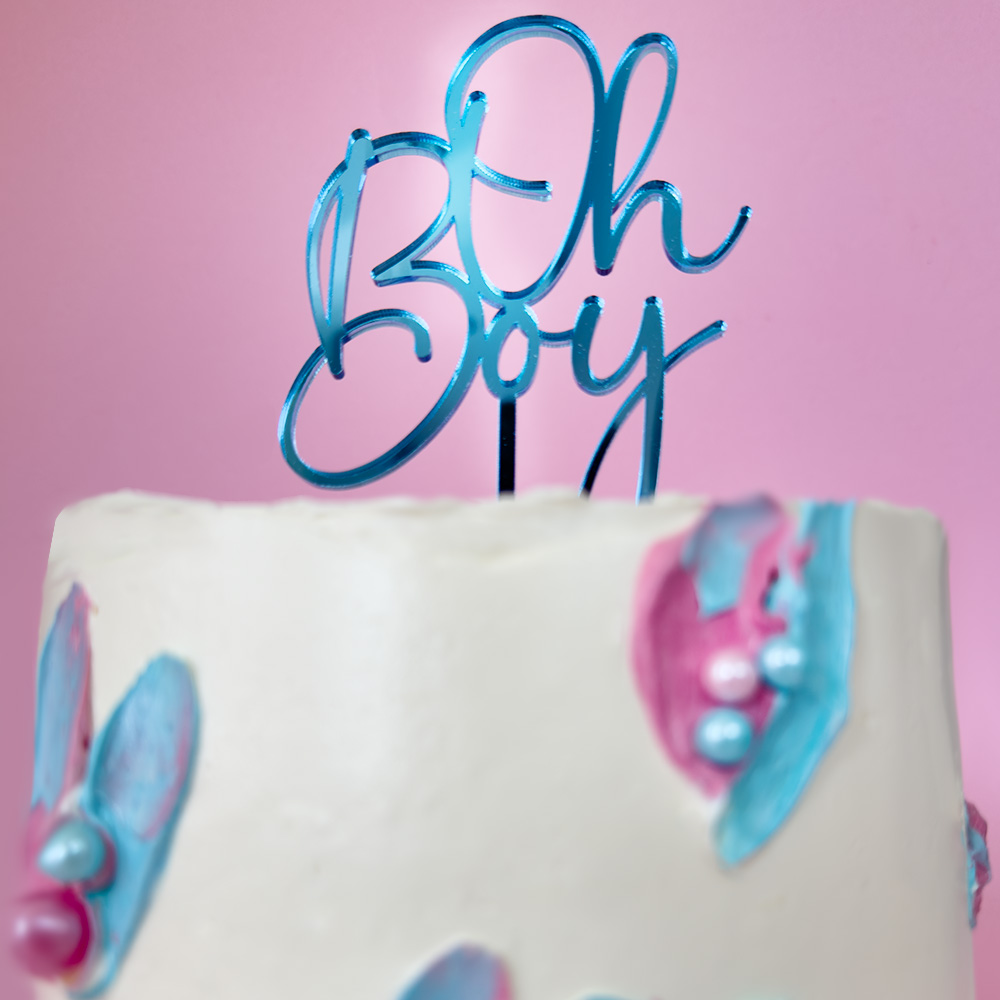 Tort na baby shower to świetny sposób na podkreślenie elegancji i stylu całego przyjęcia. Tort jest pokryty białym tynkiem. Biały krem zafarbowano na dwa kolory, które delikatnie rozsmarowano w kilku miejscach za pomocą łyżki, tworząc subtelne, pastelowe akcenty. Urocze plamki nadają mu lekkości i oryginalnego wyglądu, każdy tort ozdobiony tą techniką będzie niepowtarzalny.Dodatkową ozdobą jest delikatna posypka w kształcie perełek. Całość zwieńczona jest bestsellerowym topperem z napisem “Oh Boy” w kolorze niebieskim – to idealna dekoracja na chłopięce baby shower. Tort prezentuje się doskonale na białym podkładzie styrodurowym, którego boki zostały starannie oklejone, co nadaje całości spójny, estetyczny wygląd.