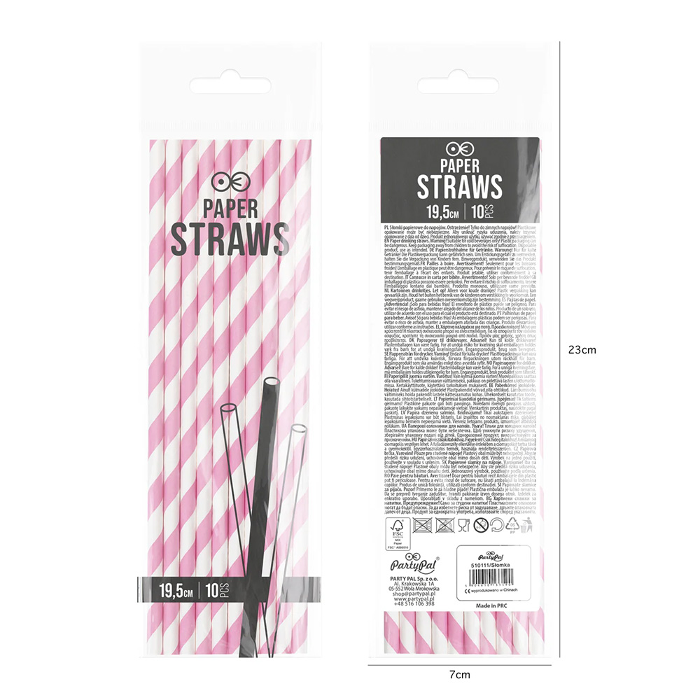 Papierowe białe słomki w różowe paski. Opakowanie zawiera 10 sztuk słomek o standardowej długości. Doskonale sprawdzą się na weselach, urodzinach, wieczorach panieńskich, baby shower oraz innych wyjątkowych okazjach.