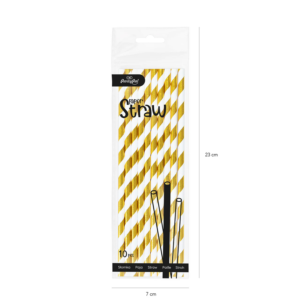 Papierowe białe słomki w złote paski. Opakowanie zawiera 10 sztuk słomek o standardowej długości. Doskonale sprawdzą się na weselach, urodzinach, wieczorach panieńskich, baby shower oraz innych wyjątkowych okazjach.