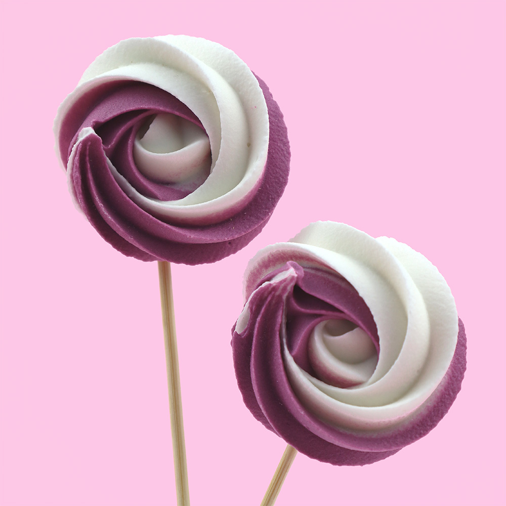 Biało-fioletowy lizak cukrowy beza. Lizak bezowy na patyczku, zapakowany w folię – idealny jako upominek dla gości z okazji chrzcin, roczku lub dekoracja tortu.