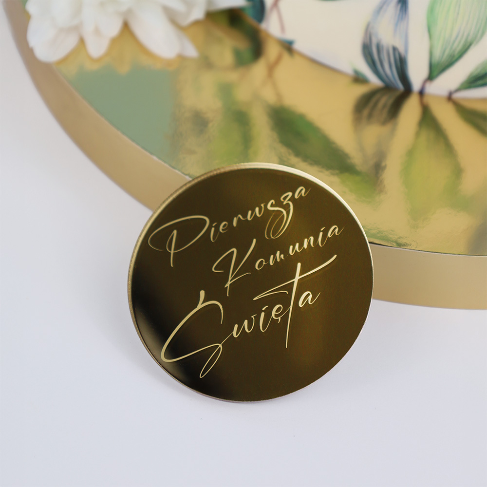 Dekor na tort komunijny to elegancka dekoracja o średnicy 6 cm, stworzona z myślą o uroczystych wypiekach komunijnych. Wykonany ze złotej plexi mały topper na tort, zachwyca subtelnym blaskiem i precyzyjnym grawerem, dodając tortowi słodkością charakteru. Dzięki lekkiej konstrukcji topper można dowolnie umiejscowić na powierzchni tortu. Dla najlepszego efektu zalecamy przymocowanie go przy użyciu czekolady lub syropu glukozowego.