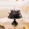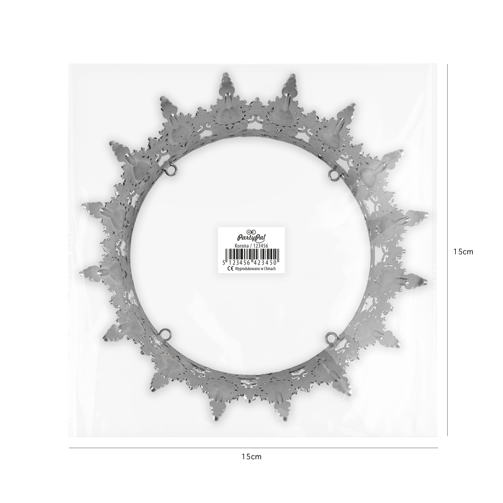 Piękna ozdoba na tort w postaci korony, idealna zarówno dla małych, jak i dużych księżniczek. Produkt wykonany z niezwykłą starannością, łączący w sobie elegancję oraz unikalny design. Korona w kolorze srebrnym z czarnymi kryształkami doda blasku każdemu przyjęciu, podkreślając jego wyjątkowy charakter.
