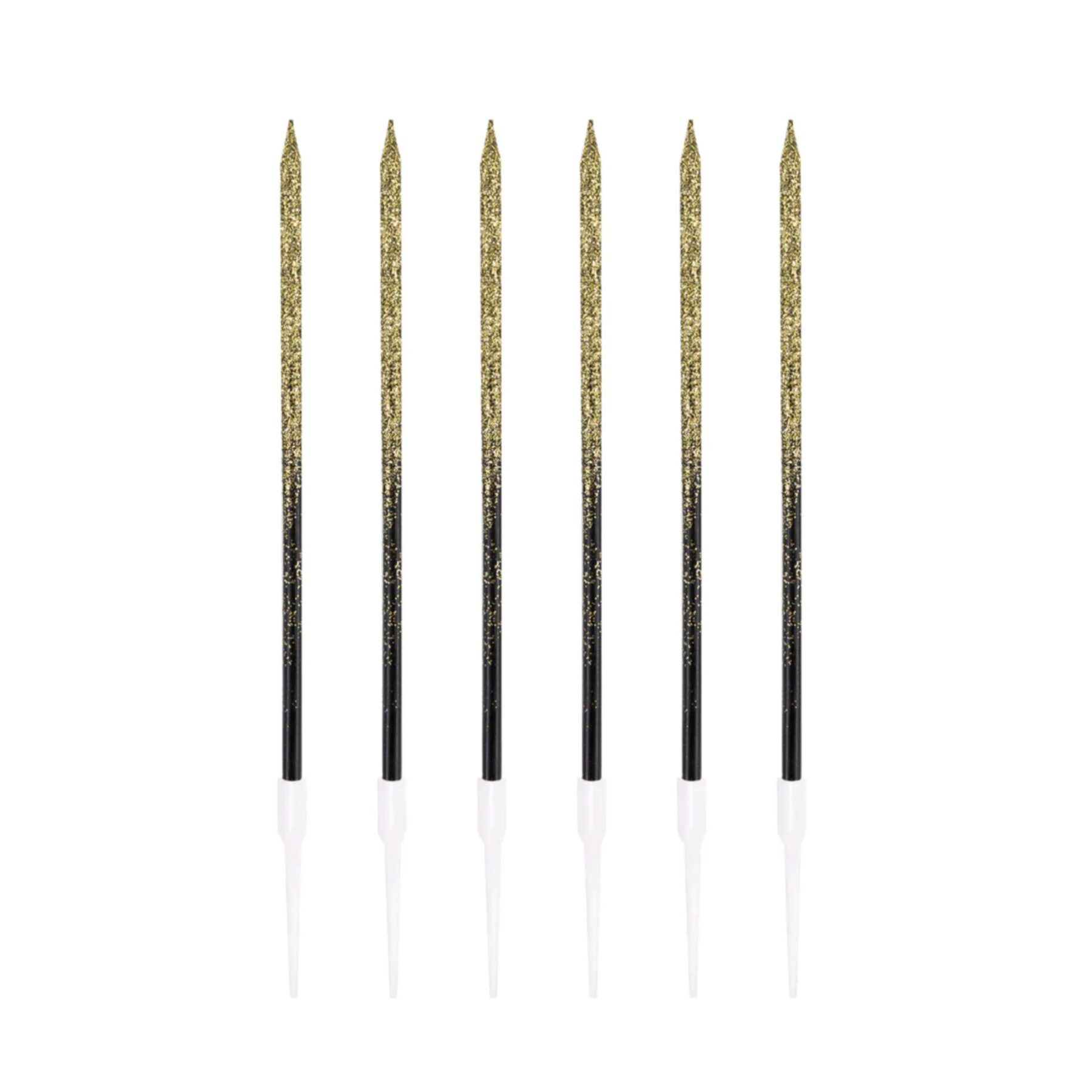 Efektowne świeczki z efektem ombre – górna część świeczki lśni złotym brokatem, który stopniowo przechodzi w głęboką, elegancką czerń. Brokatowy blask i elegancka czerń sprawiają, że świeczki będą idealne na wiele okazji – od urodzin, po rocznice, aż po wesela. Świeczki mają prostą formę i wysokość ok. 13,5 cm, co sprawia, że są uniwersalne i pasują do różnych stylów tortów. W zestawie znajdziemy 6 sztuk czarno-złotych świeczek. Do zestawu dołączone są praktyczne pikery, które umożliwiają stabilne umieszczenie świeczek na torcie.