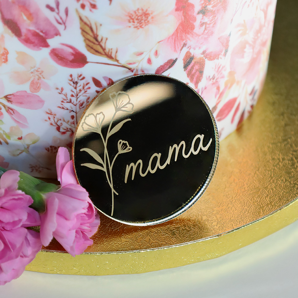 Grawerowany, okrągły dekor na bok tortu z napisem “Mama”. Wykonany ze złotej lustrzanej plexi. To piękny detal, który może pełnić rolę centralnej ozdoby tortu albo być tylko subtelnym dodatkiem – wszystko zależy od Twojej koncepcji. Topper na tort ma średnicę 6 cm i jest lekki. Bez trudu umieścisz dekor na boku lub górze tortu. By dekoracja stabilnie trzymała się kremu zalecamy przyklejenie topperu za pomocą kleju CMC, syropu glukozowego lub czekolady.