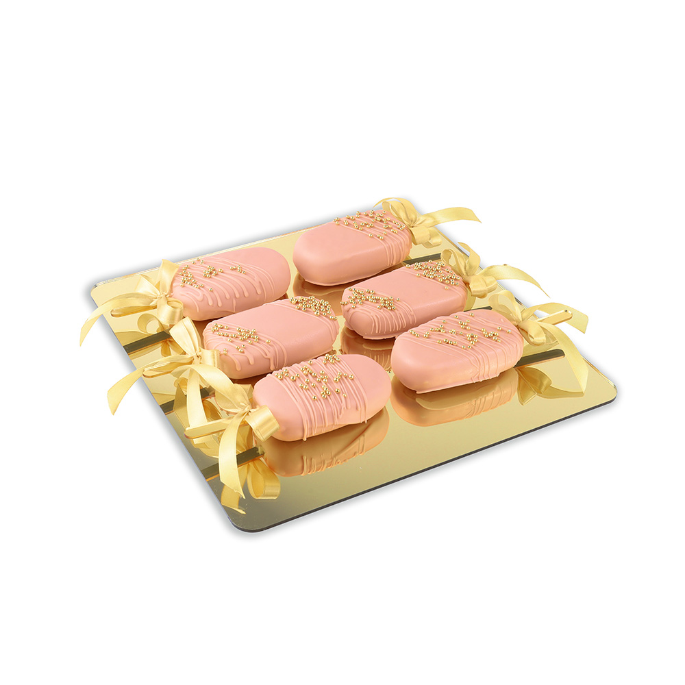 Talerze mają kwadratowy kształt z delikatnie zaokrąglonymi rogami, co nadaje im nowoczesny i subtelny wygląd. Podniesiony na nóżkach o wysokości 0,5 cm talerz, pozwala na lepszą ekspozycję słodkości. Eleganckie złoto sprawia, że tacka pasuje do każdej stylistyki słodkiego stołu. Patery na ciasta i desery świetnie prezentują się zarówno na uroczystościach o stylistyce boho, jak i nowoczesnych, eleganckich przyjęciach. Bez wątpienia z naszymi podstawkami przygotowanie słodkiego stołu staje się łatwiejsze.
