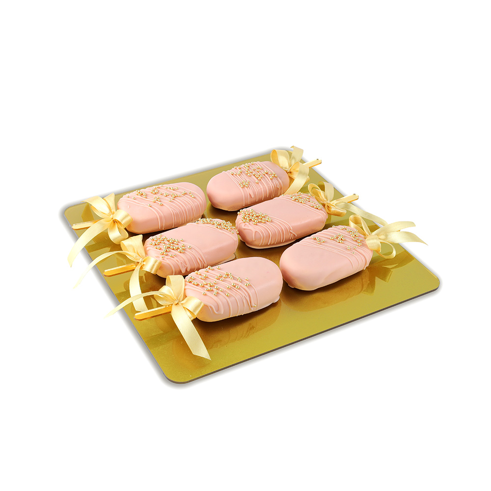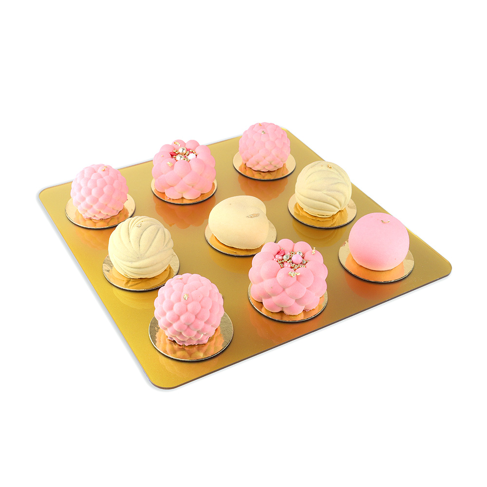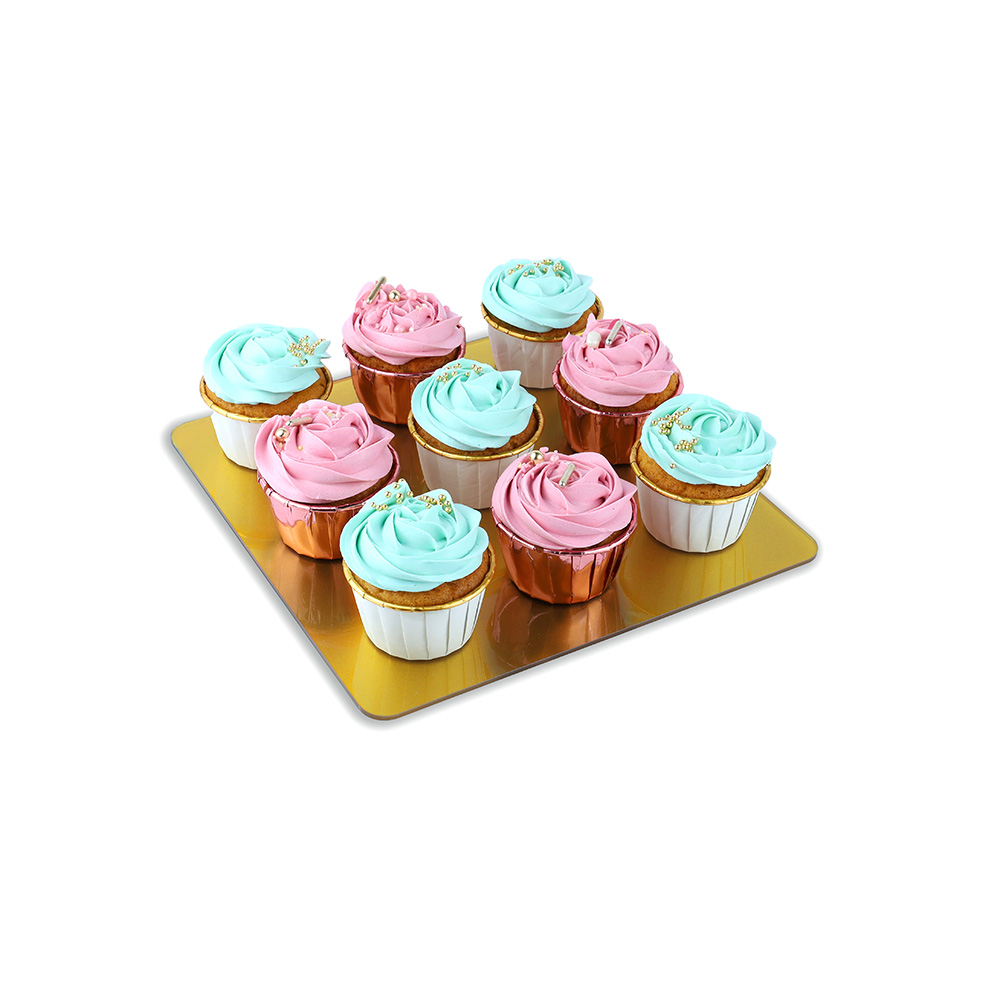 Talerze mają kwadratowy kształt z delikatnie zaokrąglonymi rogami, co nadaje im nowoczesny i subtelny wygląd. Podniesiony na nóżkach o wysokości 0,5 cm talerz, pozwala na lepszą ekspozycję słodkości. Eleganckie złoto sprawia, że tacka pasuje do każdej stylistyki słodkiego stołu. Patery na ciasta i desery świetnie prezentują się zarówno na uroczystościach o stylistyce boho, jak i nowoczesnych, eleganckich przyjęciach. Bez wątpienia z naszymi podstawkami przygotowanie słodkiego stołu staje się łatwiejsze.