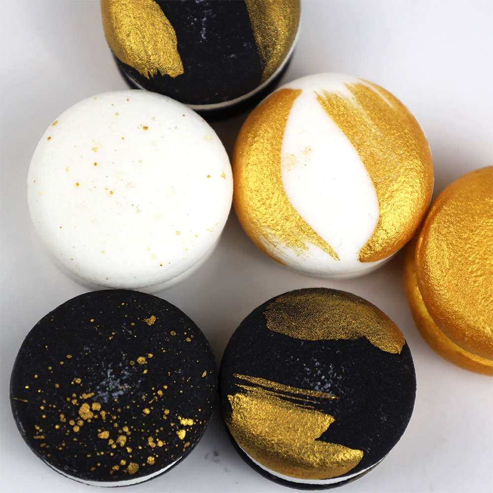 Zestaw sześciu makaroników do ozdoby tortów i ciast. Makaroniki cukrowe czarno-złote będą pięknie prezentować się na wypiekach ślubnych, komunijnych i urodzinowych. Ich unikalny design w odcieniach czerni, bieli i złota pasuje zarówno do nowoczesnych, jak i klasycznych kompozycji cukierniczych. W przeciwieństwie do tradycyjnych makaroników, Makaroniki z masy cukrowej są twarde i lekkie, co sprawia, że nie pokruszą się, ani nie zdeformują.