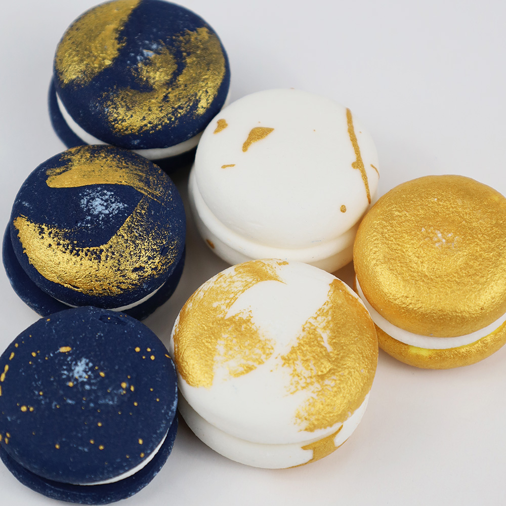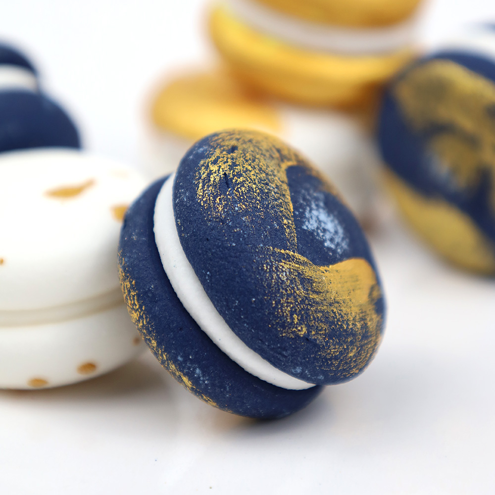 Zestaw sześciu makaroników do ozdoby tortów i ciast. Makaroniki cukrowe granatowo-złote będą pięknie prezentować się na wypiekach ślubnych, komunijnych i urodzinowych. Ich unikalny design w odcieniach granatu, bieli i złota pasuje zarówno do nowoczesnych, jak i klasycznych kompozycji cukierniczych. W przeciwieństwie do tradycyjnych makaroników, Makaroniki z masy cukrowej są twarde i lekkie, co sprawia, że nie pokruszą się, ani nie zdeformują.