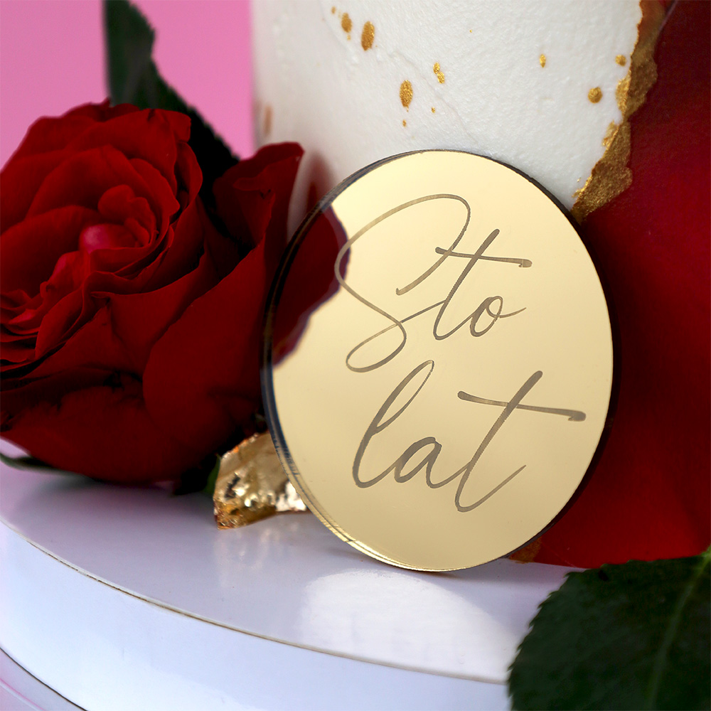 Grawerowany okrągły dekor na bok tortu Sto Lat to elegancka dekoracja, stworzona z myślą o wypiekach urodzinowych. Mini topper o średnicy 6 cm został wykonany z wysokiej jakości złotej plexi, która pięknie odbija światło. Dzięki lekkiej konstrukcji dekor można swobodnie umieścić w dowolnym miejscu na torcie, zarówno na jego boku, jak i górze. Aby uzyskać najlepszy efekt i trwałe mocowanie, rekomendujemy przyklejenie dekoru za pomocą rozpuszczonej czekolady lub syropu glukozowego.