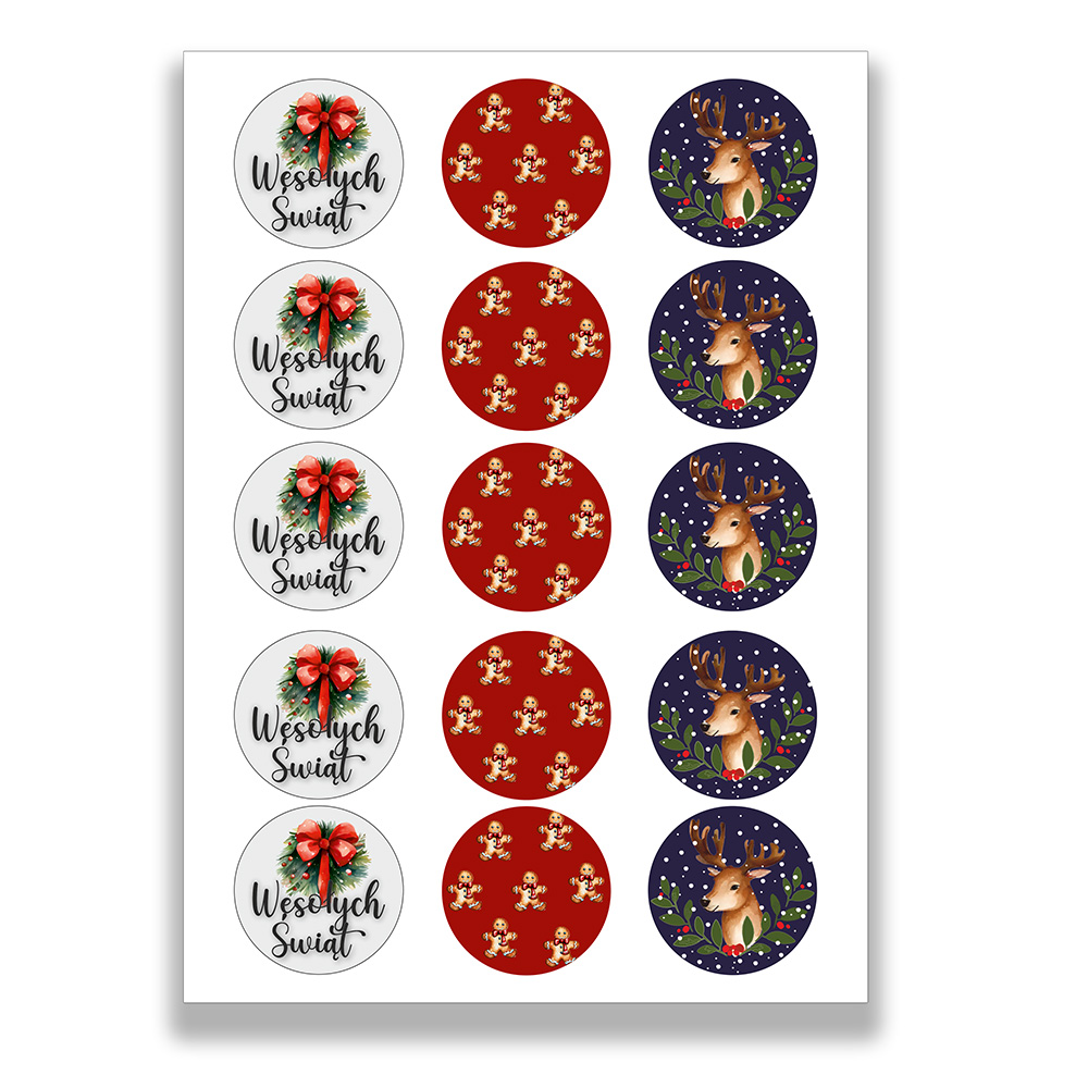 Kupując nasz świąteczny opłatek na muffinki, zyskujesz jedną kartkę formatu A4 z 15 pięknymi wydrukami. Po 5 kółek z każdego z 3 unikalnych wzorów. Dzięki różnorodnym motywom każdy znajdzie coś, co idealnie wpisze się w świąteczny klimat.