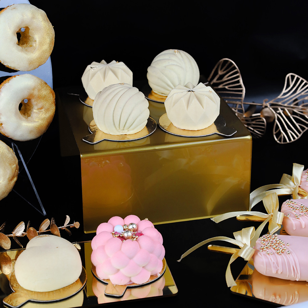Talerze mają prostokątny kształt z delikatnie zaokrąglonymi rogami, co nadaje im nowoczesny i subtelny wygląd. Podniesiony na nóżkach o wysokości 0,5 cm talerz, pozwala na lepszą ekspozycję słodkości. Elegancki odcieńzłota sprawia, że tacka pasuje do każdej stylistyki słodkiego stołu. Prostokątne patery na ciasta i desery świetnie prezentują się zarówno na uroczystościach o stylistyce boho, jak i nowoczesnych, eleganckich przyjęciach. Bez wątpienia z naszymi podstawkami przygotowanie słodkiego stołu staje się łatwiejsze.