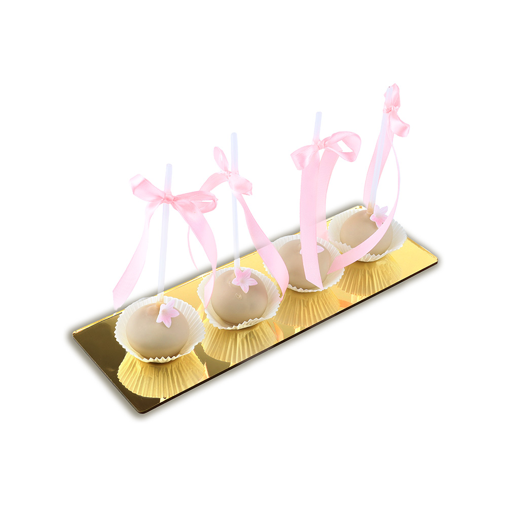 Prostokątne patery na Słodki Stół 2 sztuki złote lustro wykonane z pleksi. Zestaw ten pozwoli doskonale wyeksponować słodkości; cakepopsy, babeczki, bezy, desery, podczas uroczystości takich jak wesele, komunia, czy przyjęcie urodzinowe. W przeciwieństwie do zwykłego talerza, złote patery na słodkim stole będą prezentować się niezwykle efektownie. W skład zestawu wchodzą 2 rozmiary prostokątnych pater: 10×30 cm i 12×35 cm.