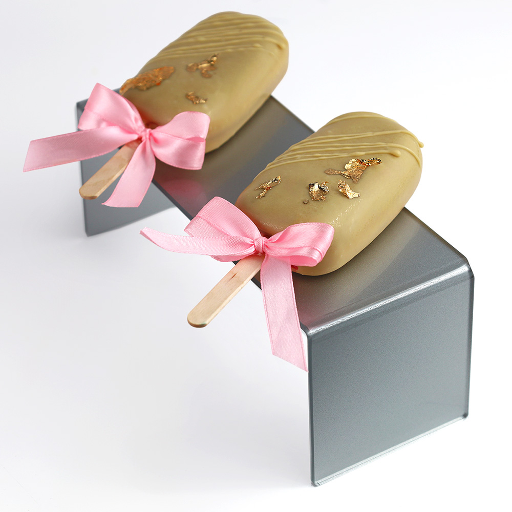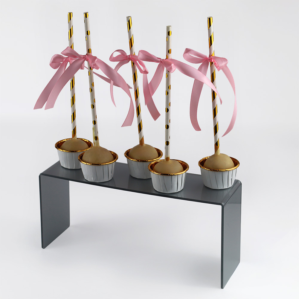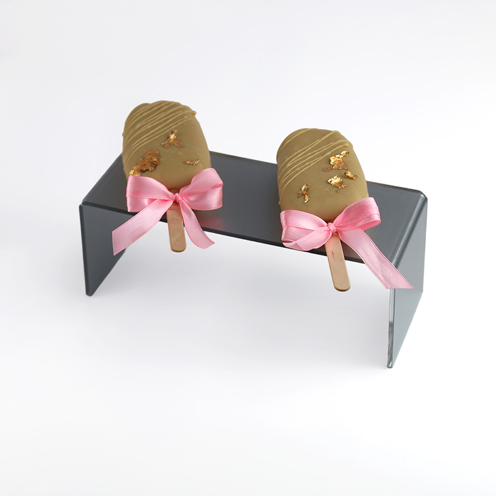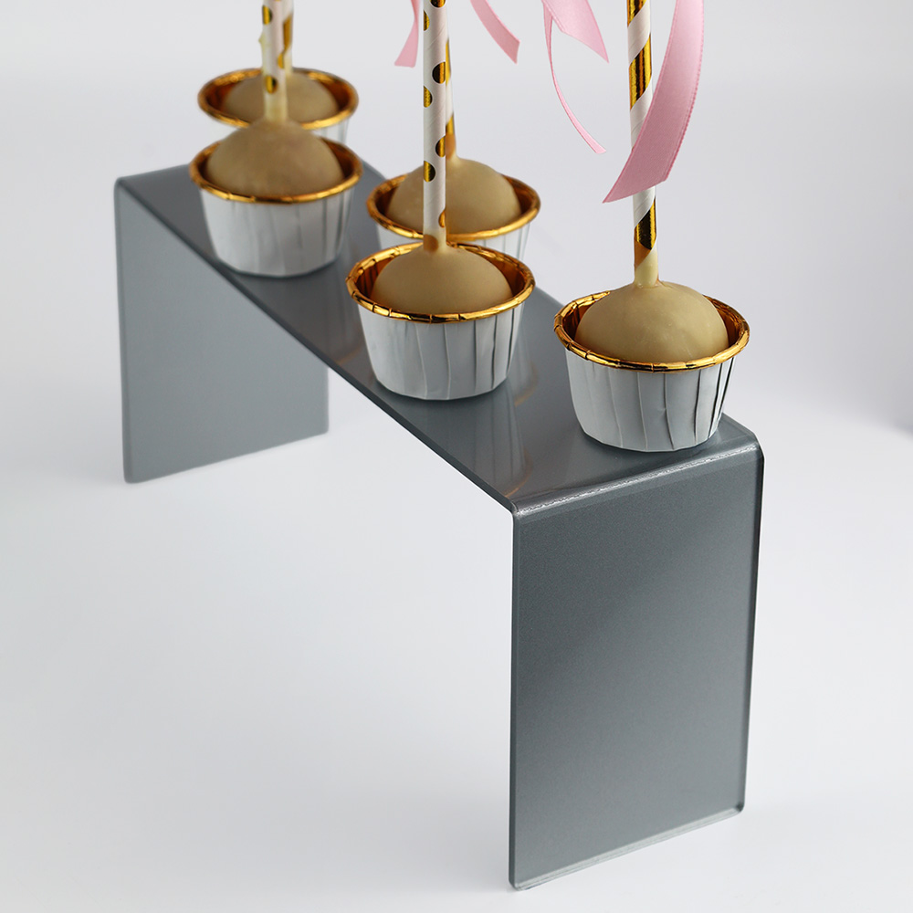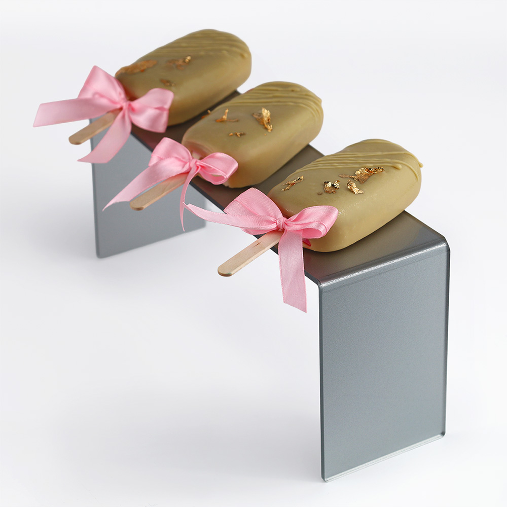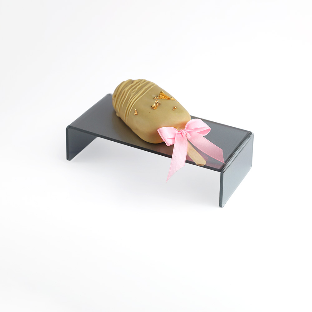 Dzięki uniwersalnej formie i błyszczącej pleksi, stojaki na monoporcje doskonale komponują się z każdą aranżacją, od klasycznej po nowoczesną. Świetnie sprawdzają się zarówno podczas uroczystości w stylu boho, jak i na eleganckich przyjęciach. Ich minimalistyczny design subtelnie podkreśla wygląd deseru, nie odwracając od niego uwagi. Stojaki mają prostokątny kształt z delikatnie zaokrąglonymi rogami i zostały wykonane z 0,3 mm plexi. Wysoka forma nie tylko efektownie eksponuje monoporcje, ale również ułatwia gościom sięganie po desery na słodkim stole.