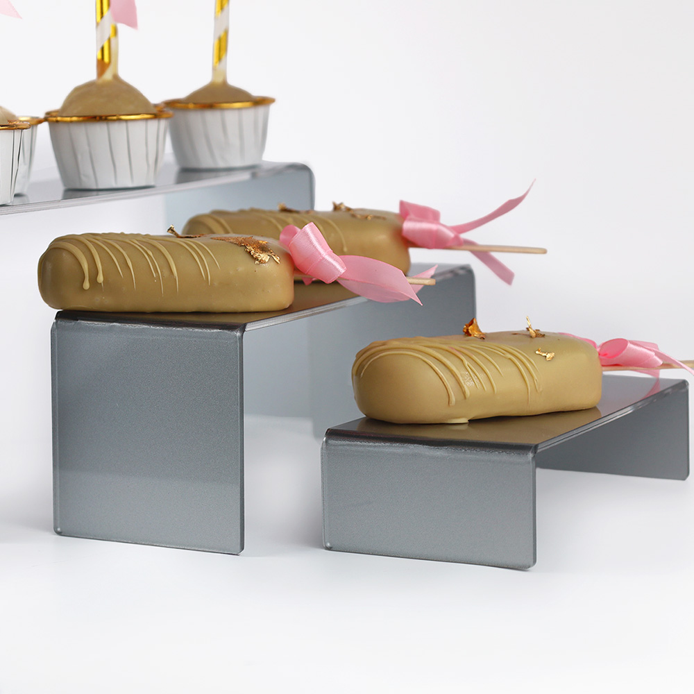 Minimalistyczne i eleganckie Prostokątne srebrne stojaki na Słodki Stół to idealne rozwiązanie do efektownej prezentacji słodkości na weselach, komuniach czy urodzinach. Dzięki nim wyeksponujesz swoje słodkości, babeczki, cakepopsy, cakesicles, ciasta lub monoporcje. W skład zestawu wchodzą prostokątne ekspozytory na monoporcje w trzech rozmiarach: 26x8x12 cm, 20x8x8 cm oraz 16x8x4 cm. Możliwość ustawienia kilku stojaków w formie schodków pozwala nie tylko efektownie wyeksponować desery, ale także ułatwia do nich dostęp.