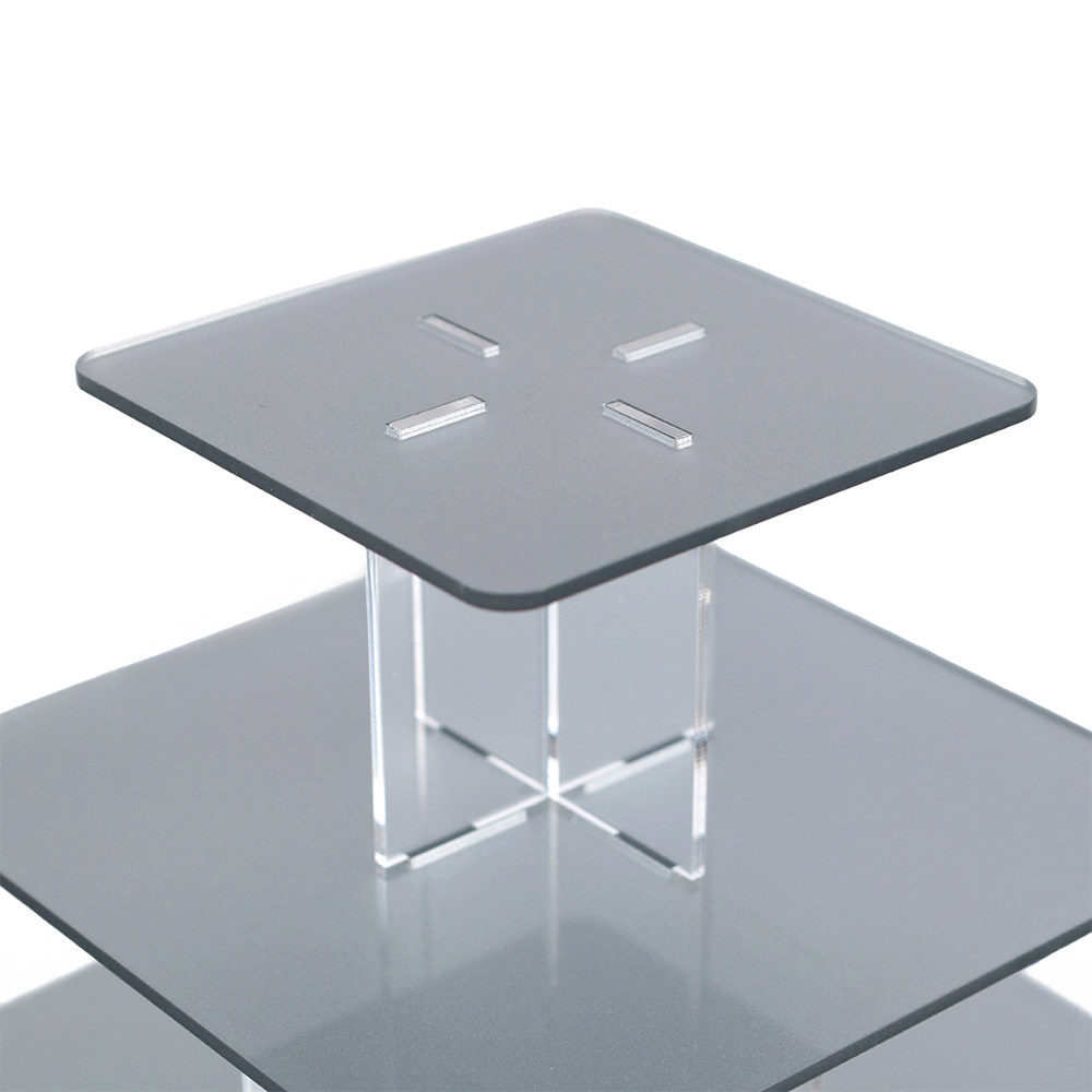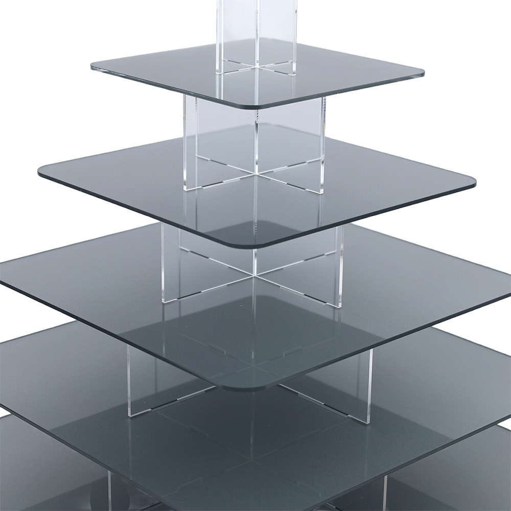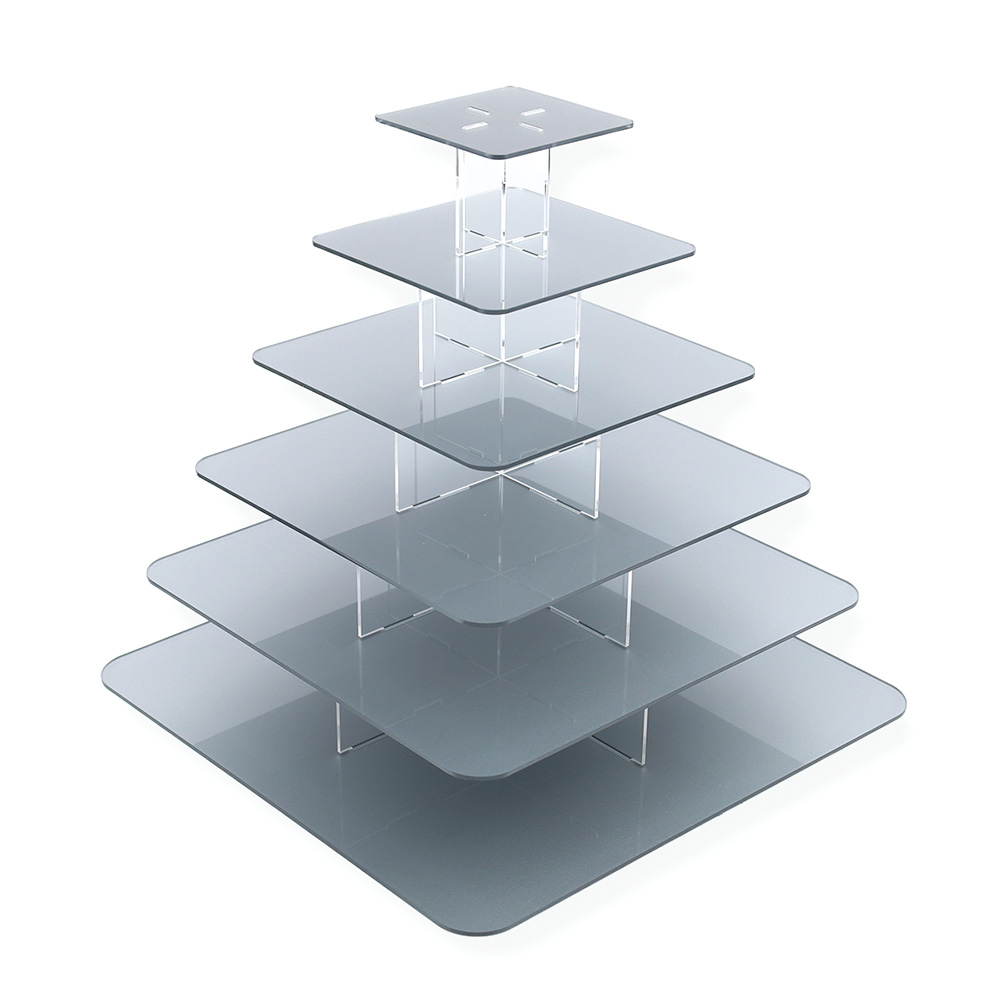 Elegancka i funkcjonalna Srebrna kwadratowa patera na monoporcje 6 pięter wykonana z wysokiej jakości przezroczystej plexi o grubości 3 mm, zaprojektowana z myślą o efektownej prezentacji monoporcji, muffinek, babeczek oraz innych deserów. Dzięki minimalistycznemu, nowoczesnemu designowi doskonale komponuje się z każdym stylem dekoracji, zarówno na przyjęciach, weselach, jak i w witrynach cukierniczych. Konstrukcja umożliwia zmniejszenie liczby pięter,dopasowując ją do ilości serwowanych smakołyków. 6 piętrowy, kwadratowy stojak na monoporcje pomieści około 40 monoporcji na bankietówkach 8 cm.