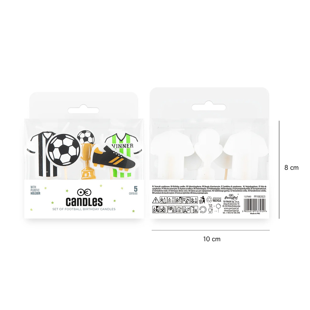Świeczki na tort piłka nożna. Zestaw zawiera 5 świeczek na tort o wymiarach ok. 2 – 4 cm. Mini świeczki pomogą Ci przyozdobić tort czy mniejsze słodkości np. babeczki. To idealny wybór jeśli przygotowujesz słodkie wypieki dla fanów footballu. Wszystkie świeczki posiadają drewniane pikery, ułatwiające umiejscowienie ich na słodkościach.