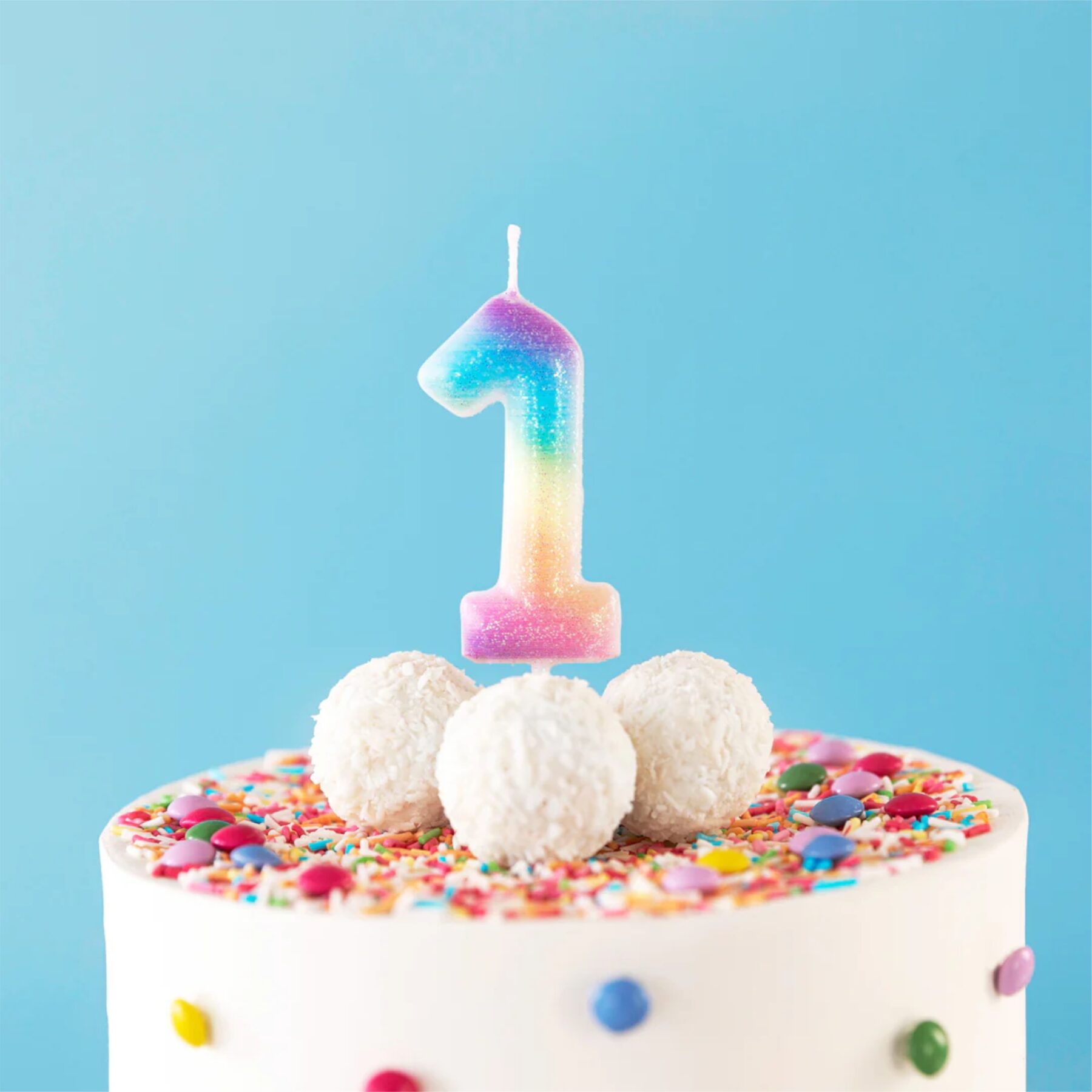 Tęczowa świeczka urodzinowa z brokatem cyfra 1