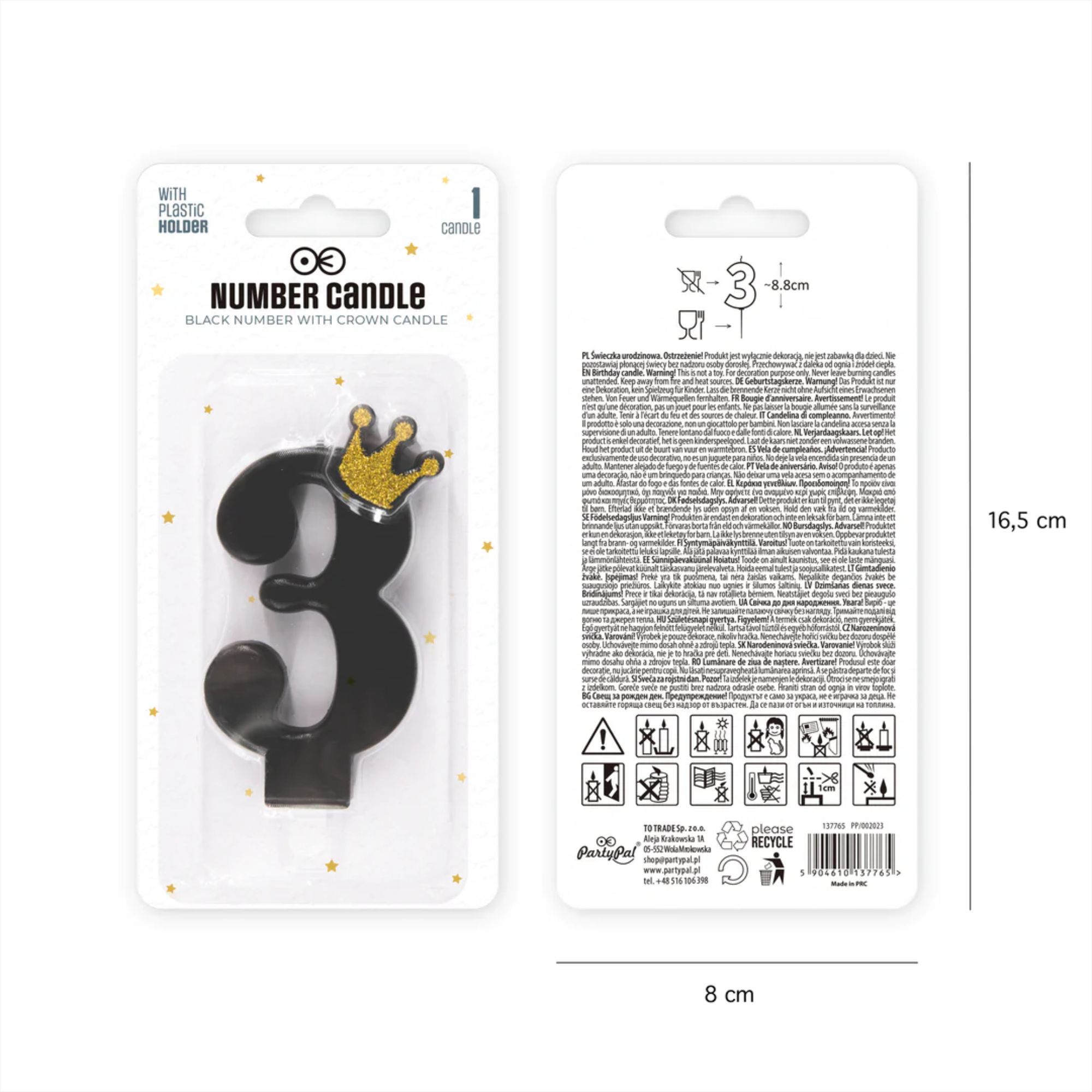 Oryginalna świeczka w kolorze czarnym z brokatową, złotą koroną. Perfekcyjna świeczka na torty urodzinowe i jubileuszowe, stworzona dla wszystkich kobiet, zarówno małych, jak i dużych, które pragną poczuć się jak królowe.Wykonana z wysokiej jakości wosku, świeczka gwarantuje długie i równomierne płonięcie. Świeczka wyposażona jest w praktyczną nóżkę, którą z łatwością wbijesz w tort czy babeczkę. Moment zdmuchiwania świeczek jest magiczny, dlatego i na Twoim torcie nie może zabraknąć świeczki w kolorze czarnym ze złotą koroną! W naszym sklepie znajdziesz ten motyw świeczek od cyfry 0 do 9. Dzięki temu, możesz łatwo spersonalizować dekorację tortu, wybierając odpowiednią cyfrę odpowiadającą wiekowi solenizanta.