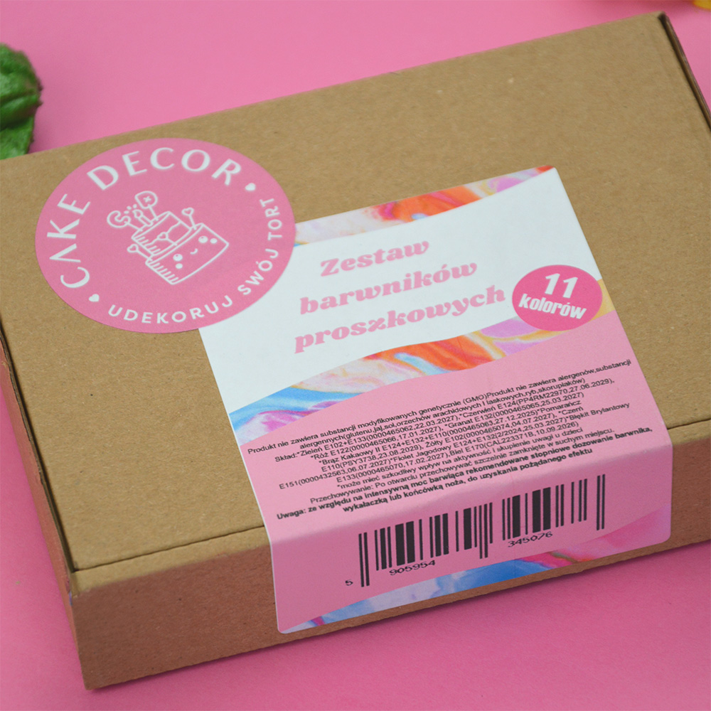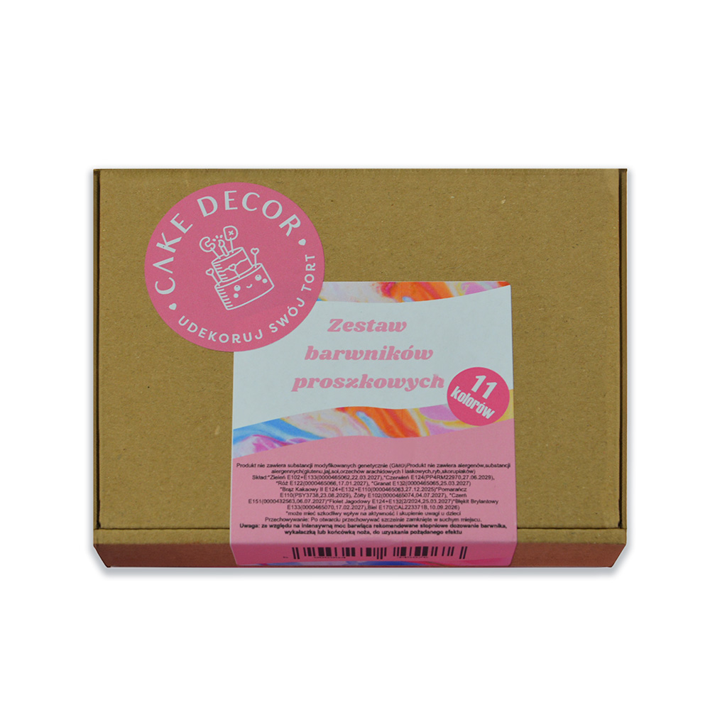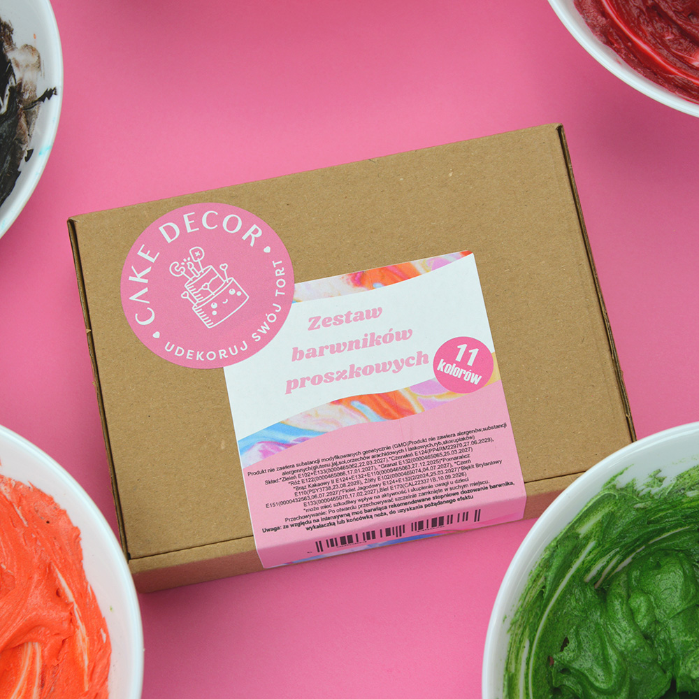 Zestaw barwników spożywczych w proszku. W zestawie znajduje się 11 barwników, każdy słoiczek zawiera 5 g produktu. Barwniki wyróżniają się wyjątkową intensywnością koloru – już niewielka ilość wystarcza, aby uzyskać intensywną barwę. By uzyskać pożądany efekt zalecamy stopniowe dozowanie wykałaczką lub końcówką noża, do uzyskania pożądanego efektu. Barwniki w proszku mają szerokie zastosowanie, nadają się do barwienia śmietany, lodów, mas cukrowych, marcepanu, kremów maślanych.